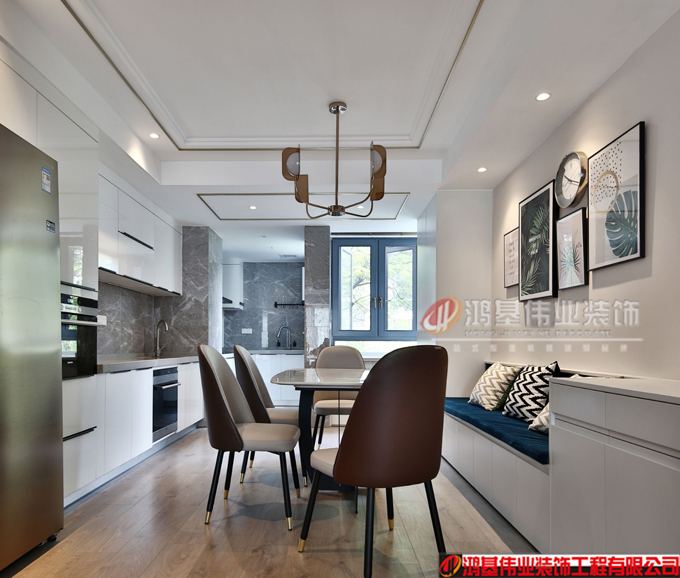 廚房和西廚的區(qū)域,空間不是很大,但是功能很強,西廚有設計烤箱、洗碗機、冰箱、操作臺,在吃飯之前洗個手,切個水果很方便。餐廳的卡座是定制的,因為餐廳的寬度不夠 所以設計了卡座來節(jié)約餐廳的空間,減少過道區(qū)域。