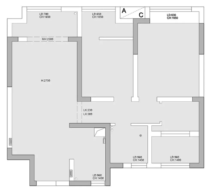 圖1.戶型分析:這是我們測量時候的原始結(jié)構(gòu),上面有介紹到是個比較常規(guī)的三居室的空間,但是在一些小細(xì)節(jié)上也存在很多的不足。1、入戶鞋柜的位置比較尷尬 左手邊深度不夠,右手邊占廚房的空間;2、原結(jié)構(gòu)主臥的衣柜按照原位置會壓縮主臥整體空間顯得會比較小;3、衛(wèi)生間空間很小,原結(jié)構(gòu)達(dá)不到業(yè)主想要的干濕分離。