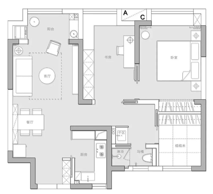 圖2.戶型改造:1、我們將利用鞋柜的柜體和削薄墻體,利用第一扇內(nèi)嵌門,能保證過道的寬度,鞋柜的正常深度和廚房的空間利用最大化;2、我們利用第二扇內(nèi)嵌門,將衛(wèi)生間改造成干濕分離,原本以為淋浴空間比較小,現(xiàn)場的實際感受也比較舒適;3、我們利用第三扇內(nèi)嵌門,將北面的小房間打造成榻榻米房,業(yè)主說冬天的時候坐在榻榻米上泡腳就近衛(wèi)生間應(yīng)該是一件很享受的事情;4、我們利用第四扇內(nèi)嵌門,打造了小兩口的書房和臥室的套間;5、我們利用第五扇內(nèi)嵌門,打造了臥室和書房可開可合的空間。