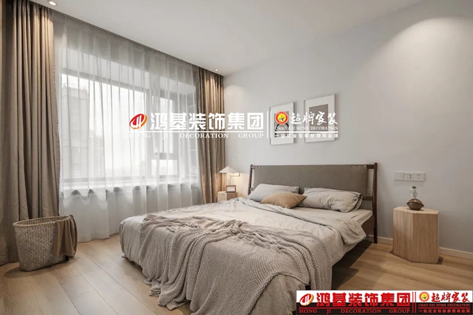 主臥,極簡的墻頂面設(shè)計搭配原木地板,裝飾畫修飾床背景,灰褐色大床搭配卡其窗簾,低飽和的色彩制造舒眠環(huán)境。